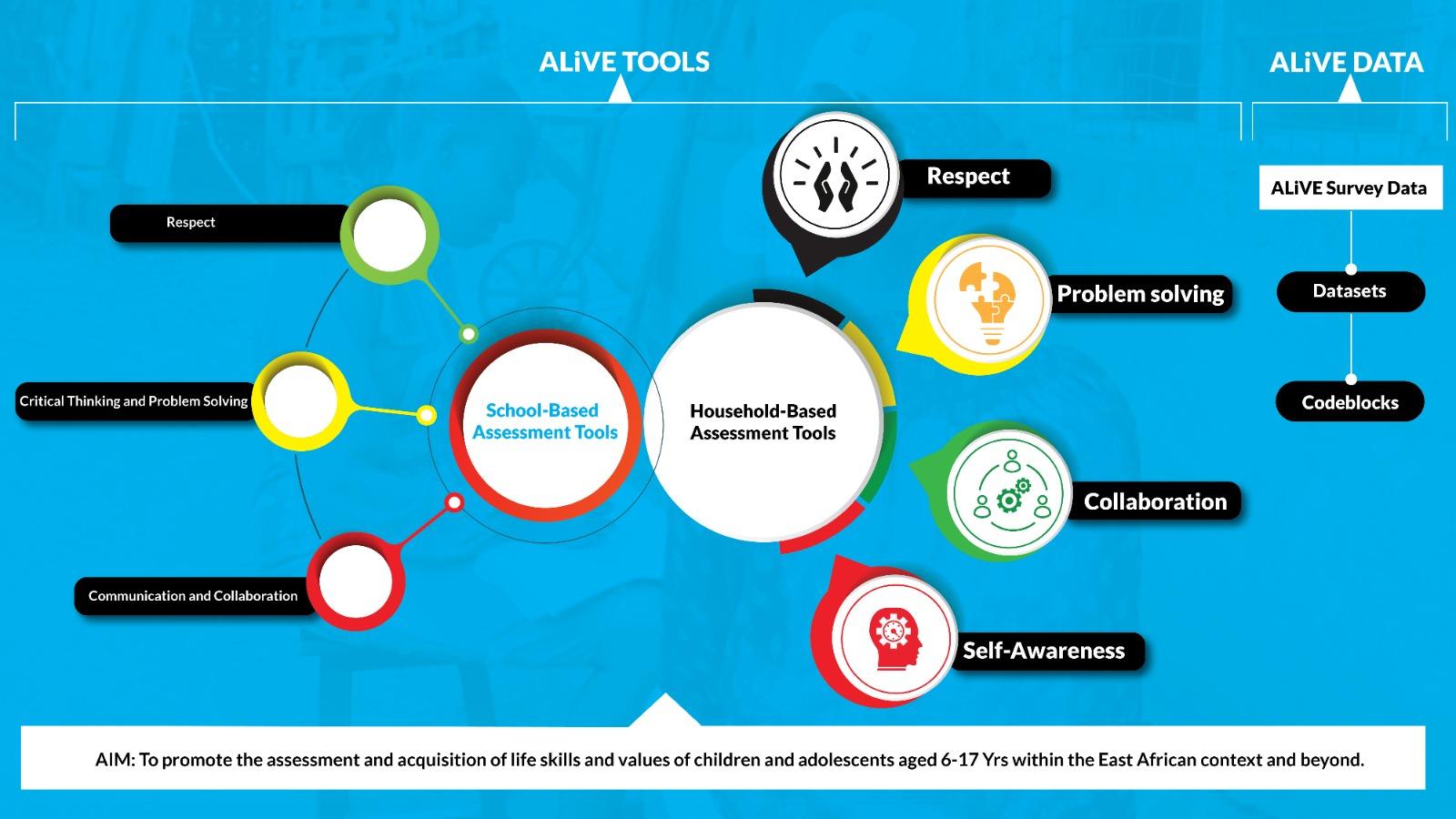 To enhance local expertise and increase access to contextualized assessments of life skills and values, ALiVE has created an open-source platform with tools for children (6-12 years) and adolescents (13-17 years). This platform is for use by government, CSOs, researchers, and others to assess children or learn about assessing life skills and values. The goal is to produce evidence to inform policies and practices in education systems in East Africa and beyond. We invite education practitioners from government, civil society, academia, and development partners to use the ALiVE tools to contribute to the evidence base on life skills and values in children and adolescents both regionally and globally.